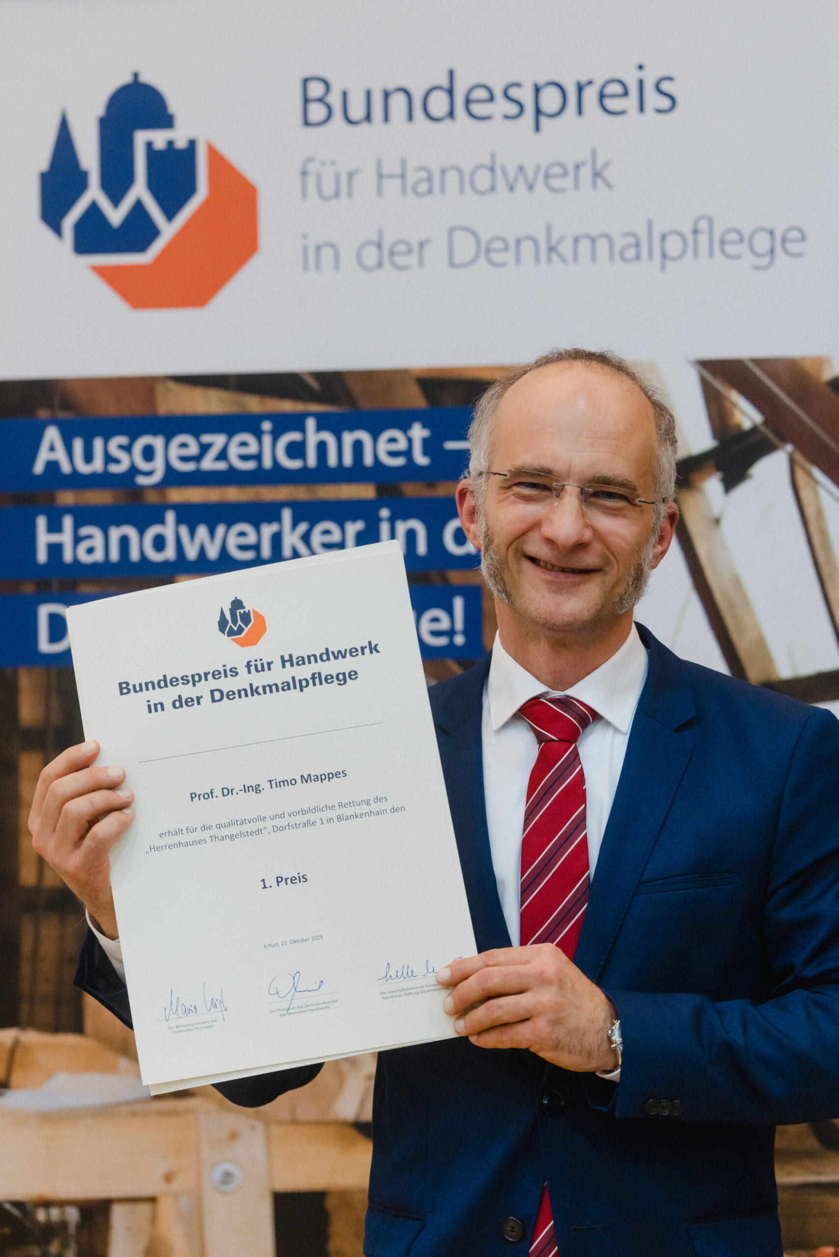 Den ersten Preis erhielt Professor Dr. Timo Mappes aus Blankenhain für die aufwendige Wiederherstellung des barocken Herrenhauses Thangelstedt. Mit großem Respekt vor der Originalsubstanz gelang es, die künstlerische und architektonische Qualität des Bauwerks von 1682 zu neuem Leben zu erwecken – ein Musterbeispiel für den erfolgreichen Schulterschluss zwischen Bauherren und Handwerk.